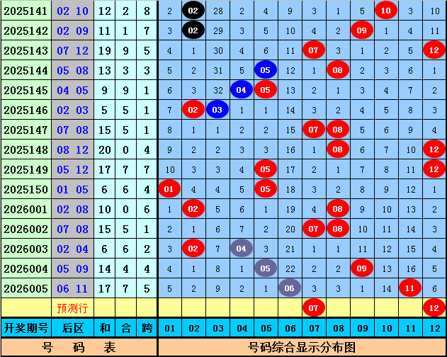 后区号码分析:在第006期历史同期开奖中奖,奖号05出现7次,奖号03 06 07 12出现4次,奖号02 08 09出现3次,奖号04 10出现2次,奖号01 11出现1次。本期后区五码参考01、02、07、09、12。