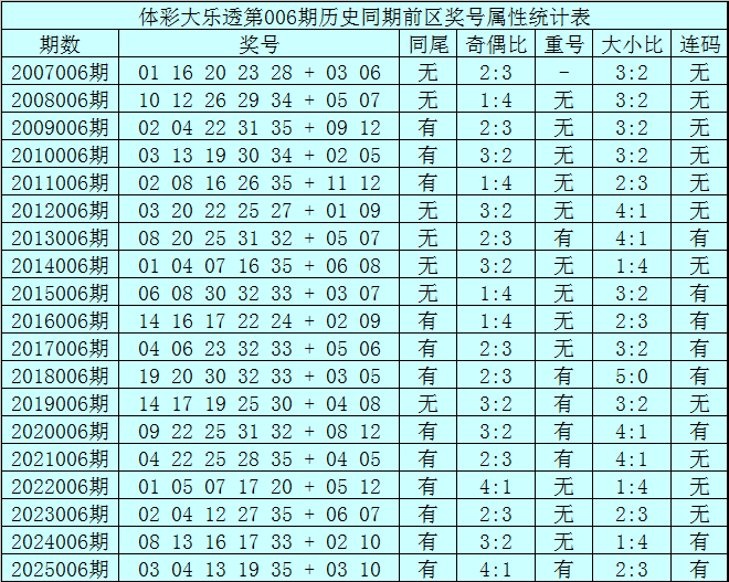 体彩大乐透第006期历史同期开出19次奖号,其统计详见下表: